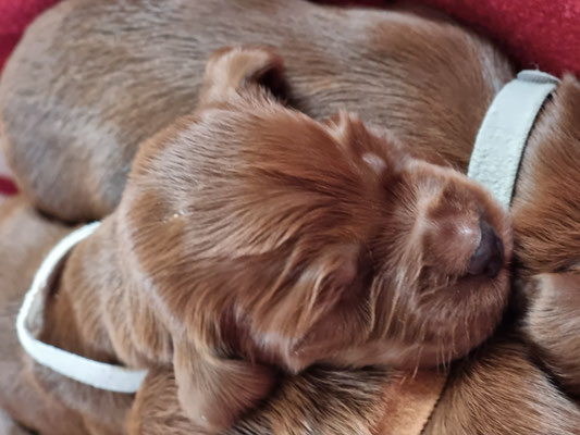 Alle Welpen entwickeln sich prächtig. Leider hat es die kleine weiße Hündin nicht geschafft und verstarb. Wir sind darüber sehr traurig.